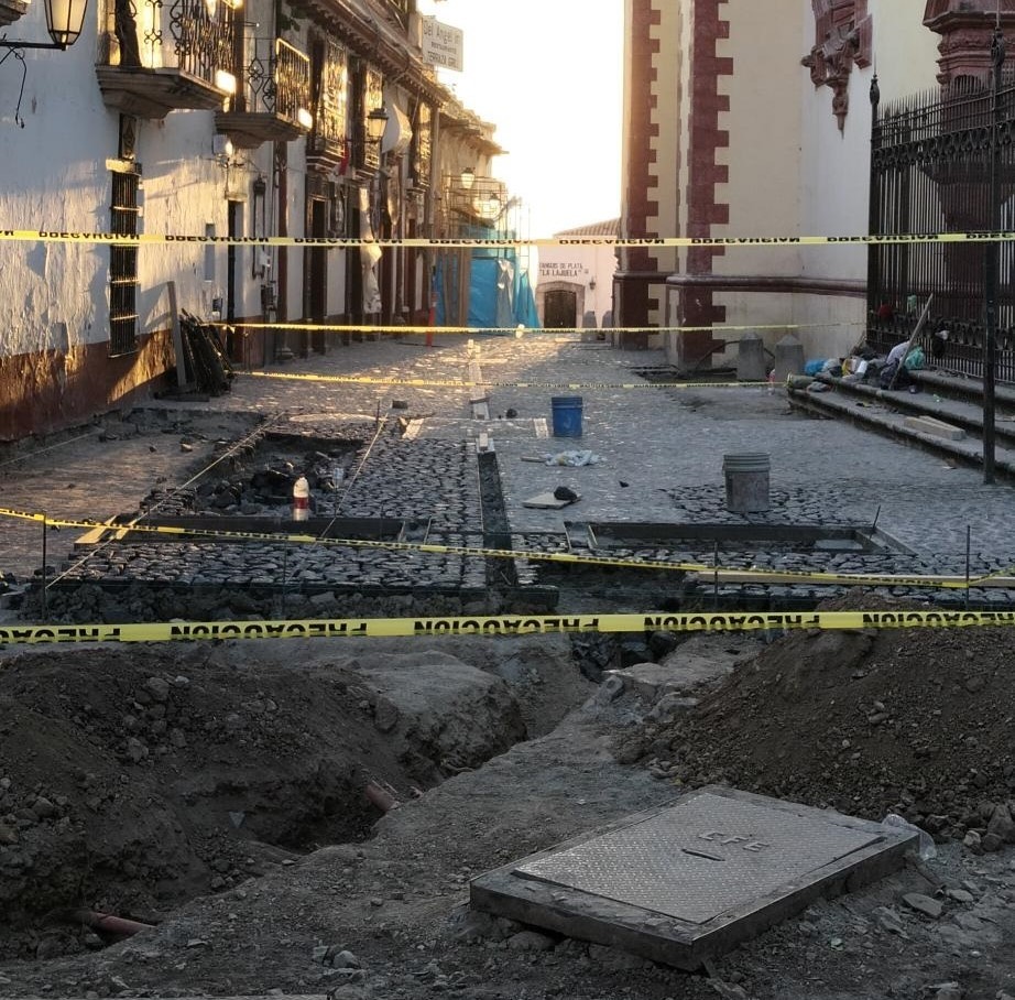Sobre la conocida “Calle de la Muerte” del centro histórico de Taxco, se encontraba un empedrado tradicional en buenas condiciones con una placa conmemorativa del año de 1879, pero a raíz de la remodelación del zócalo que ha sido considerada como una obra destructiva, innecesaria e impuesta por la autoridad local para la comprobación de recursos públicos, el piso fue derribado por parte de empleados bajo la coordinación del contratista, Gerardo García Carbajal.
