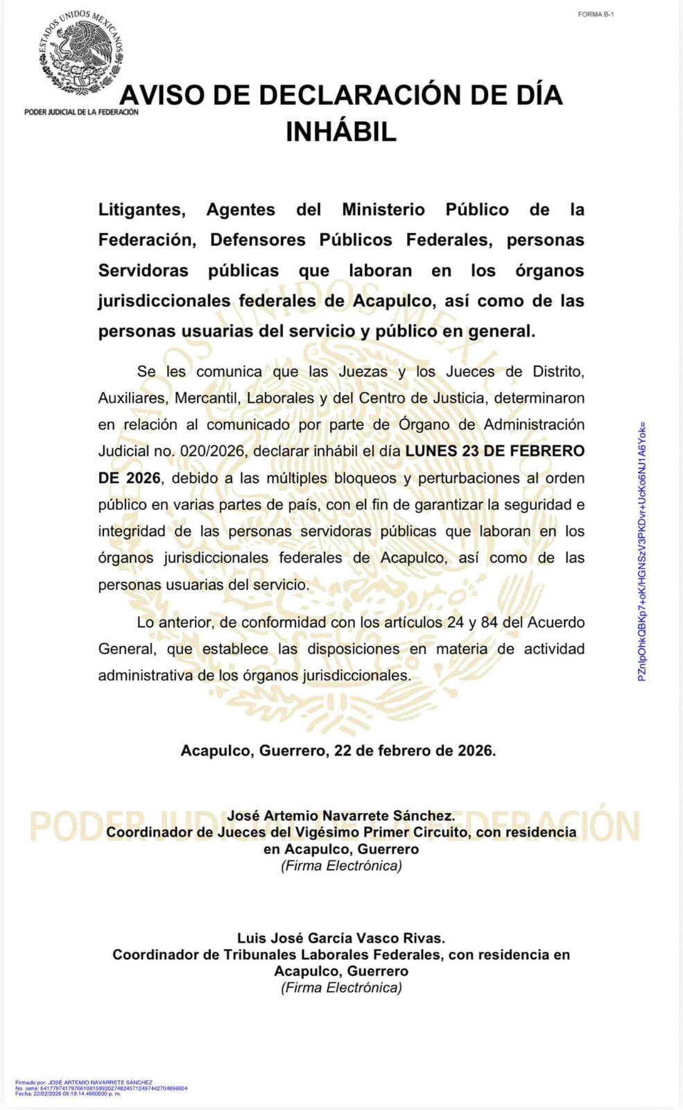JUECES DEL VIGÉSIMO PRIMER CIRCUITO EN ACAPULCO *declaran día inhábil al lunes 23 de febrero* (Comunicado)