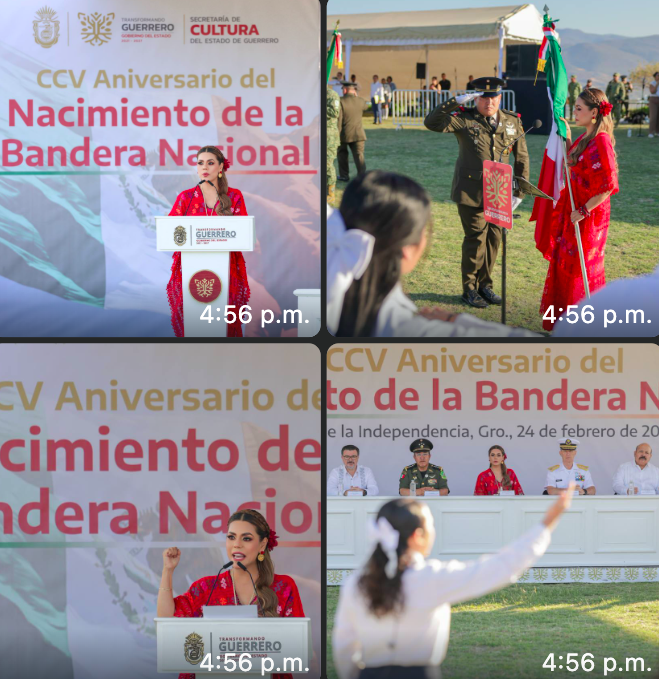 Posteriormente, la titular del Ejecutivo estatal se trasladó al Museo de la Bandera y Santuario de la Patria, acompañada del alcalde de Iguala, Erik Catalán Rendón y mandos de las fuerzas armadas, donde participó en la toma de protesta a escoltas en un acto simultáneo con la presidenta de México.