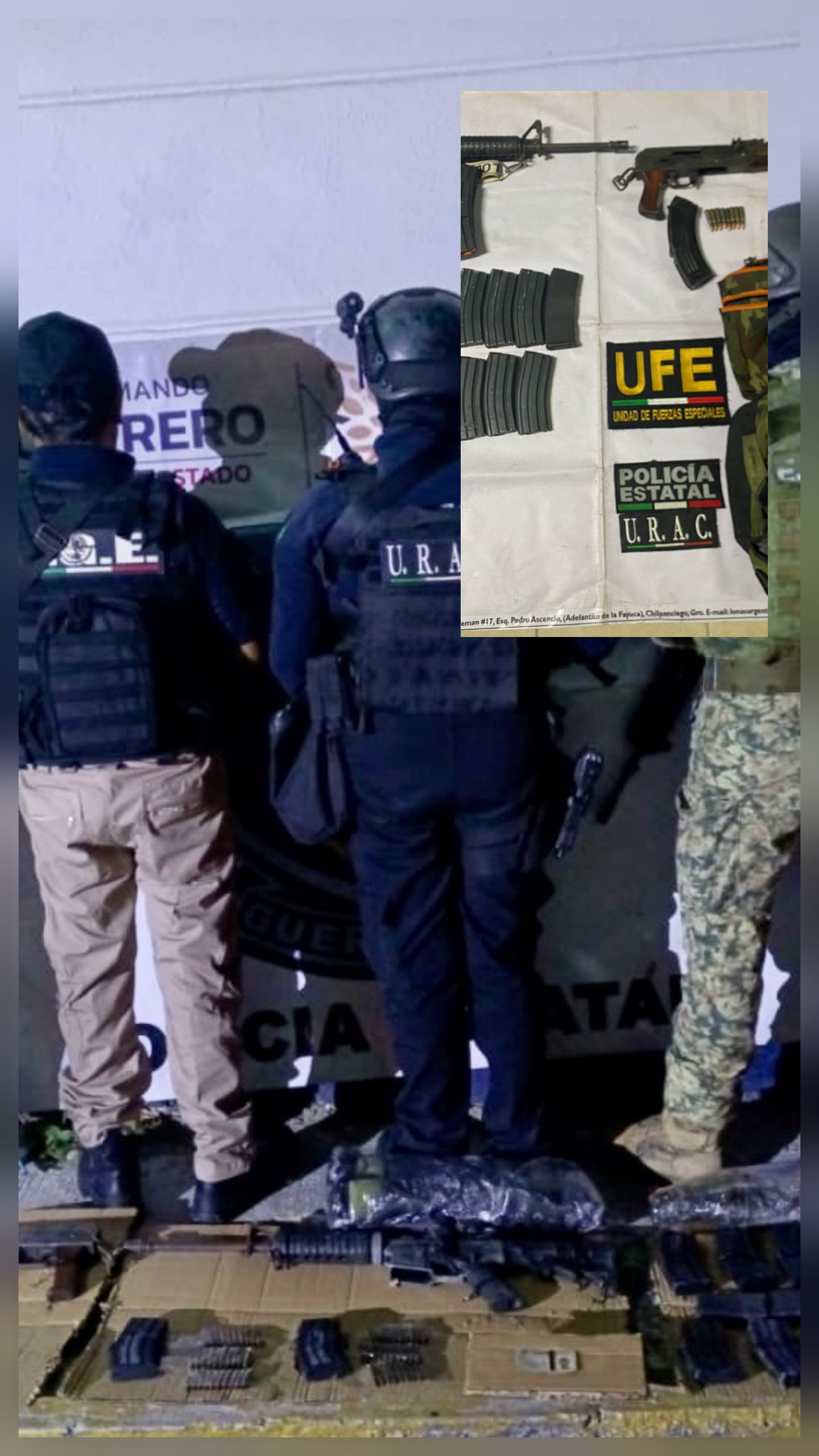 Acapulco, Gro., 26 de febrero de 2026. Como resultado de una acción coordinada entre la Policía Estatal, el Ejército Mexicano, Secretaría de Marina y la Fiscalía General del Estado, se logró el aseguramiento de armas largas, cargadores y cartuchos útiles en la colonia La Venta del municipio de Acapulco.Lo anterior se derivó de la atención a un reporte recibido a través del número de emergencias 911, mediante el cual se alertaba sobre la presencia de una persona presuntamente relacionada con actividades ilícitas en la zona. Al arribar al lugar y realizar recorridos pie tierra, el personal operativo localizó, en el interior de una maleta color verde, dos armas de fuego largas, diversos cargadores y cartuchos útiles.Entre lo asegurado se encuentran un arma larga tipo AR-15 calibre .223 con cargadores abastecidos, un arma AK-47 calibre 7.62×39, así como cargadores adicionales y cartuchos útiles. Los objetos asegurados fueron puestos a disposición de la autoridad competente para las investigaciones correspondientes.La Secretaría de Seguridad Pública del Estado de Guerrero refrenda su compromiso de continuar trabajando de manera coordinada para prevenir e inhibir conductas delictivas en la entidad.Protegiendo a Guerrero, cercanos a ti.