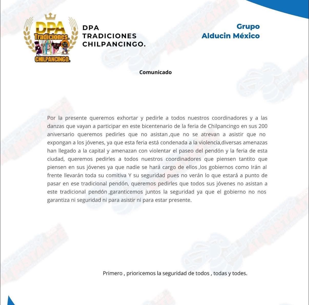 “Por la presente queremos exhortar y pedirle a todos nuestros coordinadores y a las danzas que vayan a participar en este bicentenario de la feria de Chilpancingo en sus 200 aniversario, queremos pedirles que no asistan, que no se atrevan a asistir que no expongan a los jóvenes, ya que esta feria está condenada a la violencia, diversas amenazas han llegado a la capital y amenazan con violentar el paseo del pendón y la feria de esta ciudad”,