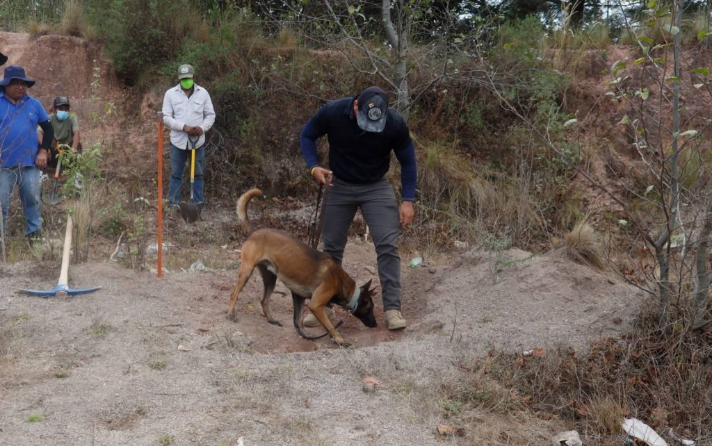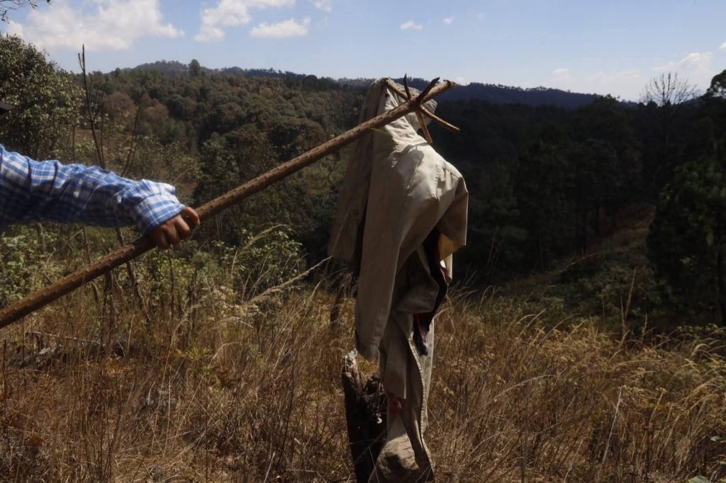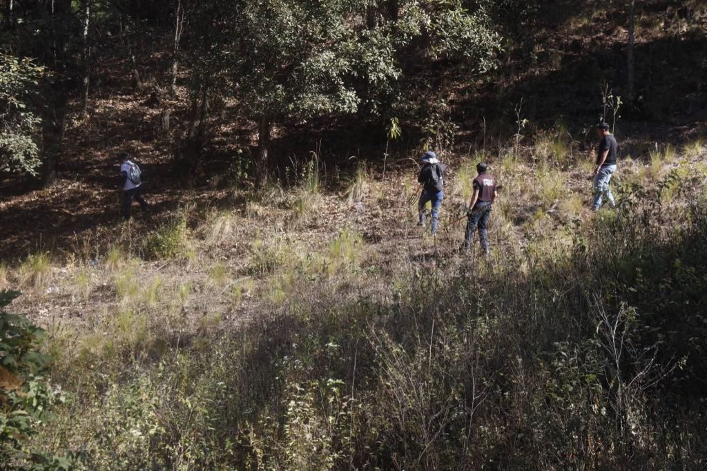 En los primeros pasos las buscadoras y buscadores detectaron un olor fétido, de inmediato escarbaron entre las hojas secas de los ocotes y enterraron una varilla para verificar si había un hundimiento, olieron la punta de la varilla, pero era tierra húmeda. Al seguir el rastro del olor se descartó cuando se dieron cuenta de que había un animal muerto sobre la orilla de la carretera. El recorrido continuó en las empinadas y accidentadas laderas, donde las hojas lisas de los pinos dificultaban el paso. Sin embargo, no era impedimento para las familias que buscan a sus desaparecidos.
