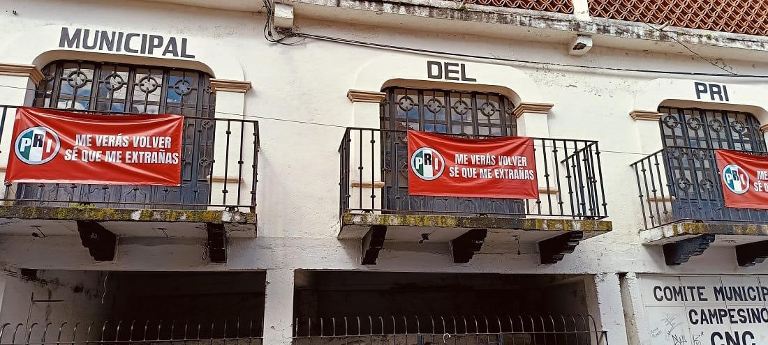 Sobre los barandales del comité local priista fueron colocadas distintas lonas color rojo con el mensaje subliminal, “me veras volver, sé que me extrañas”, en un evidente anuncio de que ese partido a cargo de los seguidores de Añorve Ocampo regresará a gobernar el municipio, sin embargo, el edificio está vacío y las oficinas de los sectores femenino y campesino permanecen cerradas con candado, con puertas metálicas decoloradas y oxidadas y paredes pintarrajeadas.