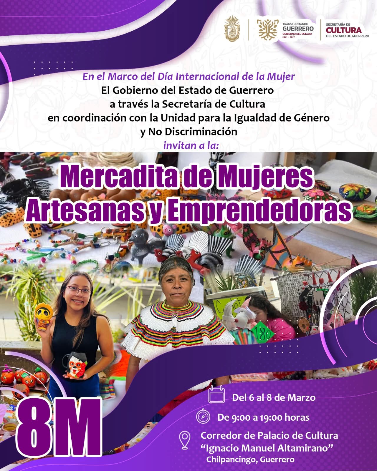 En el marco del Día Internacional de la Mujer, el gobierno del estado impulsa espacios para fortalecer la economía y visibilizar el talento femenino con la realización de la “Mercadita de Mujeres Artesanas y Emprendedoras”, que se llevará a cabo del 6 al 8 de marzo en el Corredor del Palacio de Cultura “Ignacio Manuel Altamirano”, en Chilpancingo.