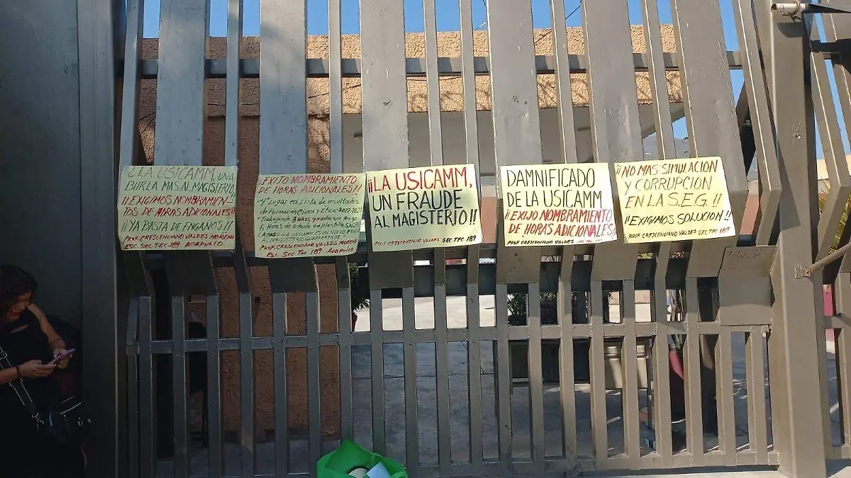 El solitario manifestante indicó que desde hace 16 años es docente de la Escuela Secundaria Técnica No. 189 de Acapulco, imparte la asignatura de Formación Cívica y Ética desde el año 2019 cubre seis horas adicionales que se encuentran sin titular derivado de Los procesos de jubilación.