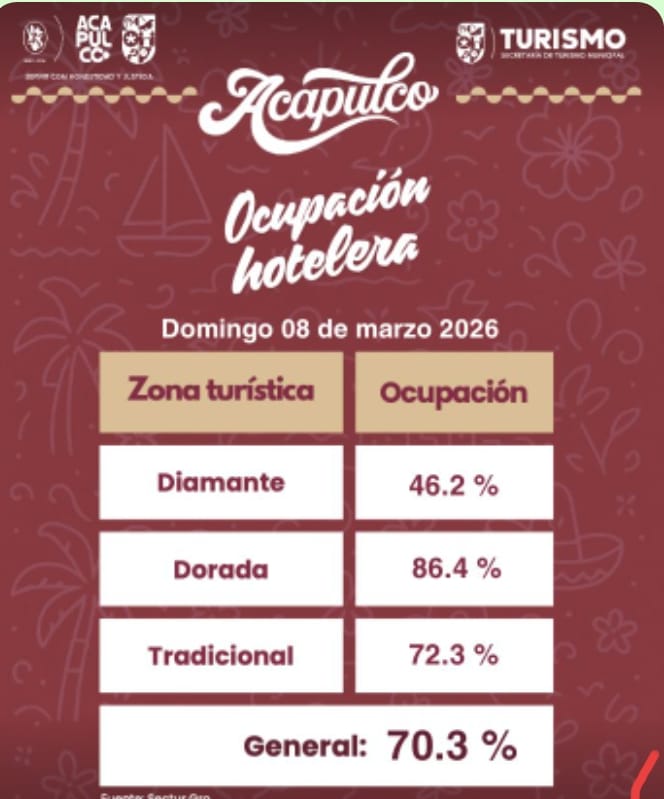 Este domingo, Acapulco reportó una ocupación hotelera general del 70.3 por ciento, con base en datos de la Secretaría de Turismo.