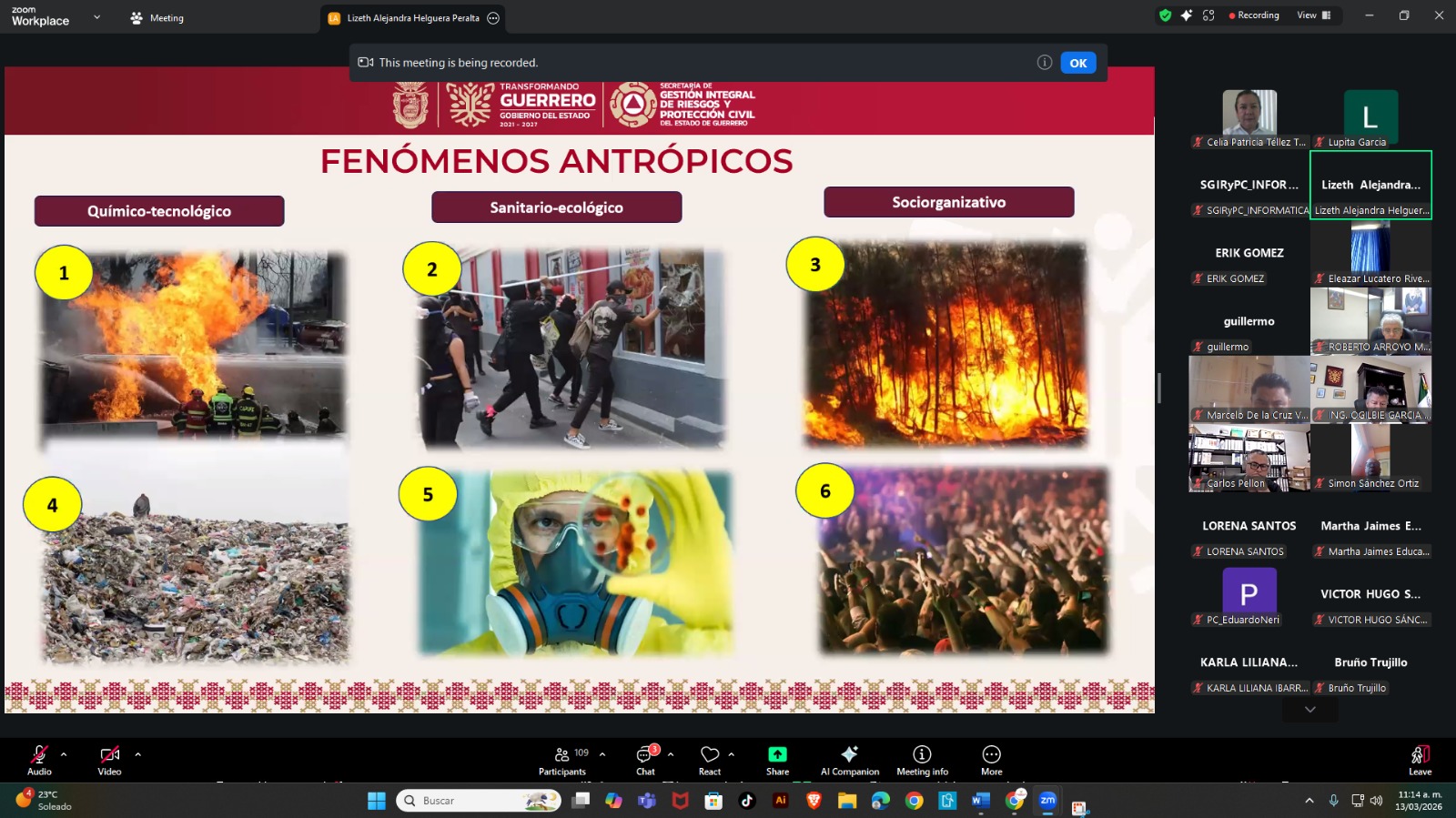 La primera conferencia se realizó de manera virtual a través de la plataforma Zoom y estuvo a cargo de la jefa del Departamento de Fenómenos Antrópicos, Lizeth Alejandra Helguera Peralta, quien abordó los conceptos, características e impactos de estos fenómenos, así como la importancia de implementar acciones preventivas para reducir riesgos en las comunidades.