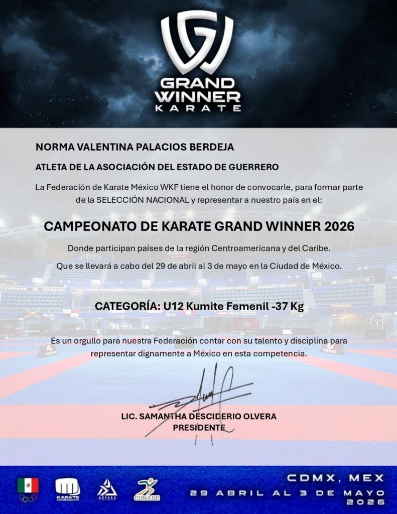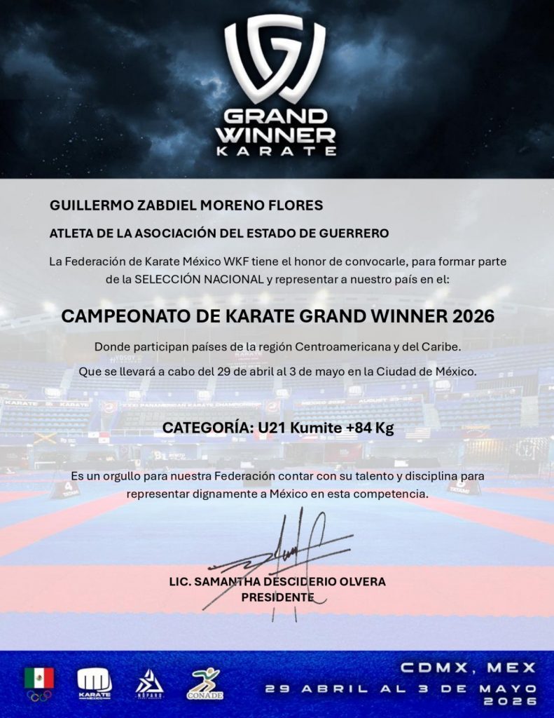Chilpancingo, Gro., 23 de marzo de 2026.- En seguimiento al impulso al talento deportivo de la entidad a nivel local, nacional e internacional, el gobierno estatal que preside la gobernadora Evelyn Salgado Pineda, celebra la convocatoria de dos destacados karatecas guerrerenses para integrarse a la Selección Nacional de Karate de la Federación México WKF, quienes fueron convocados para representar a México en el prestigioso Campeonato de Karate Grand Winner 2026.
