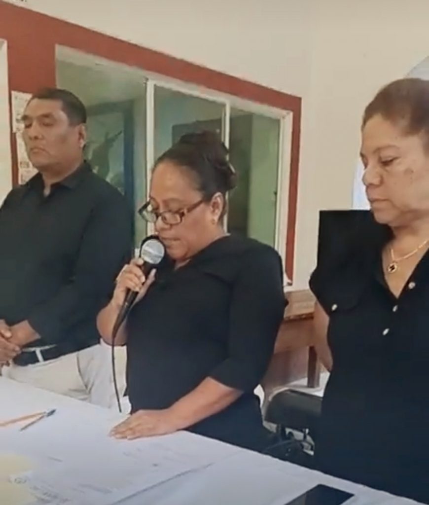 Es la sesión de Cabildo Abierto, están la Síndica Cecilia Tapia Martínez, de MC; las Regidoras Natividad León Mosso de MC; Sebastiana Peláez Gálvez del PRI y Doroteo Gregorio Candia también del PRI. Una silla vacía, con un crespón blanco, es la del Regidor Bartolo Casarrubias. Sí, hay Quorum y la sesión inicia con la ausencia del Alcalde Ramón Lorenzo Cárdenas y del Regidor Faustino Bravo y Sandibeli Roque Espinoza, de MC y MORENA respectivamente.