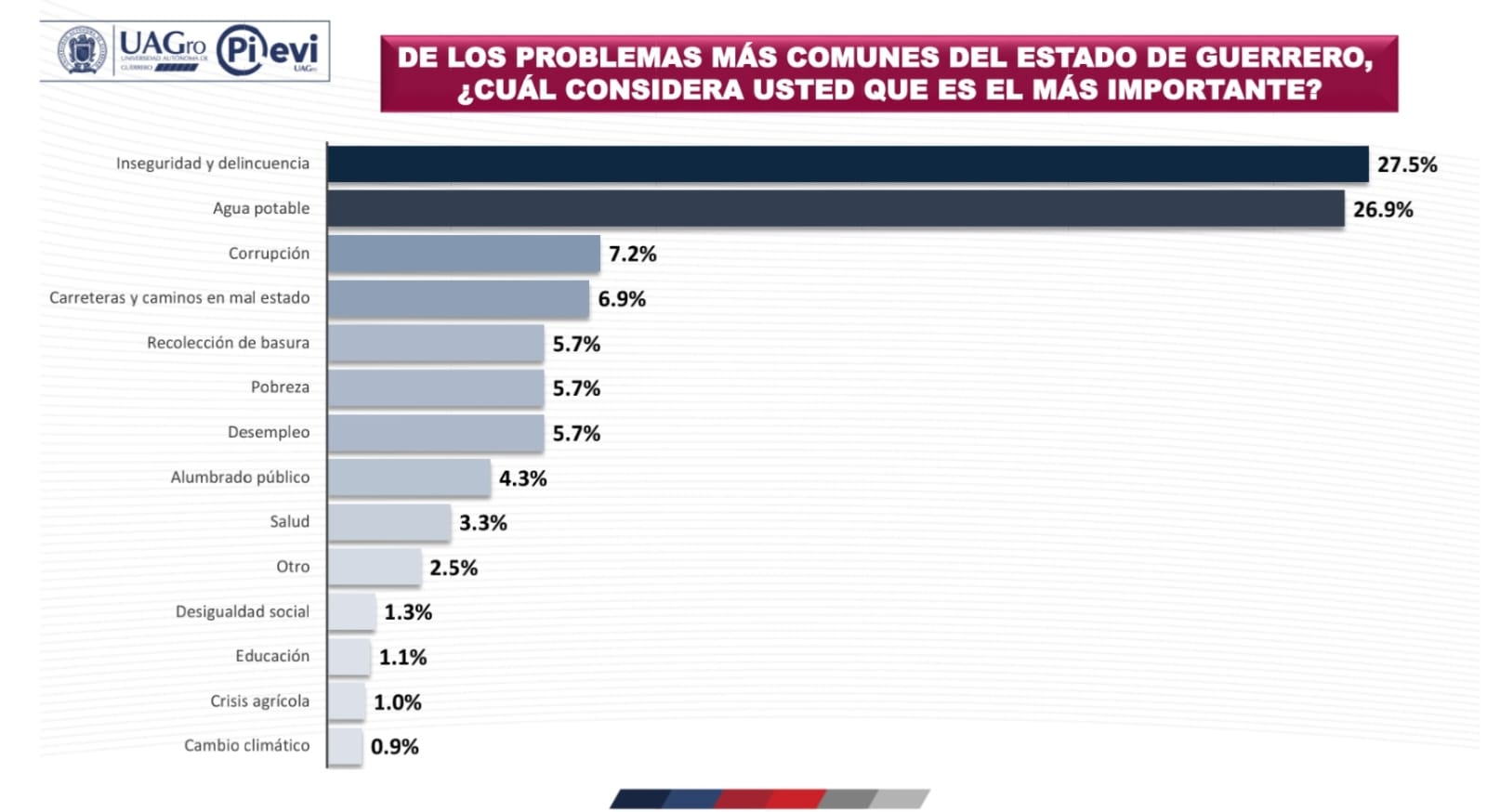 Cabe hacer notar que el objetivo principal de esta encuesta fue medir la percepción de la ciudadanía sobre sus preferencias electorales por partidos y personajes que aspiran al gobierno del estado en las elecciones del 2027, sin embargo en el primer cuestionamiento realizado a los encuestados se les pregunta acerca “de los problemas más comunes del estado de Guerrero” y, en este sentido, “¿cuál considera usted que es el más importante?