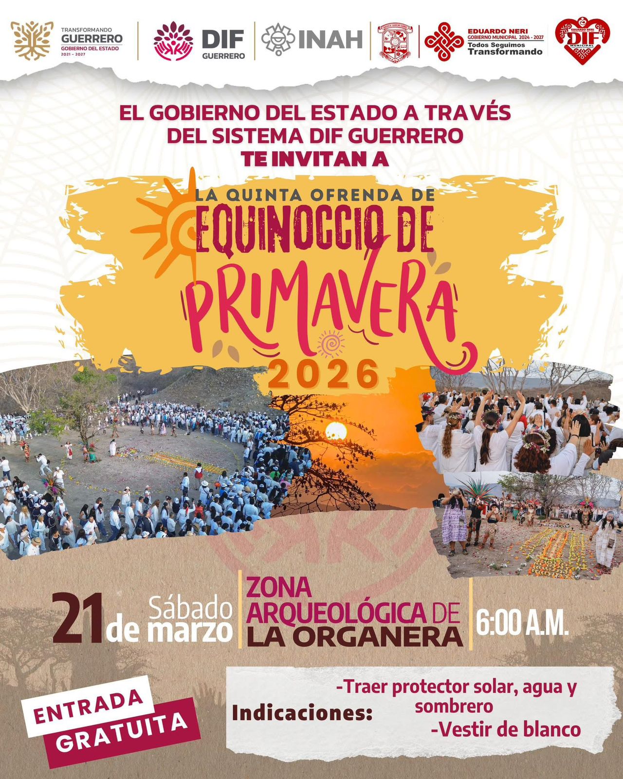Chilpancingo, Gro., 17 de marzo de 2026.- El gobierno del Estado a través del Sistema DIF Guerrero, invita a la ciudadanía a participar en la “Ofrenda de Equinoccio de Primavera 2026”, una actividad que promueve la conexión con la naturaleza, la cultura y las tradiciones ancestrales, dicha celebración se realizará por quinta ocasión consecutiva y donde miles de personas han podido disfrutar de este evento que celebra el inicio de la primavera.