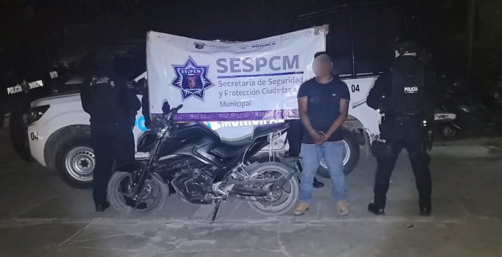 En un segundo hecho, en la colonia Morelos, elementos de la Policía Preventiva detectaron a un masculino en actitud evasiva, quien trasladaba una motocicleta. Al realizar la revisión correspondiente, se confirmó que la unidad contaba con reporte de robo, procediendo a su aseguramiento y a la detención del conductor.