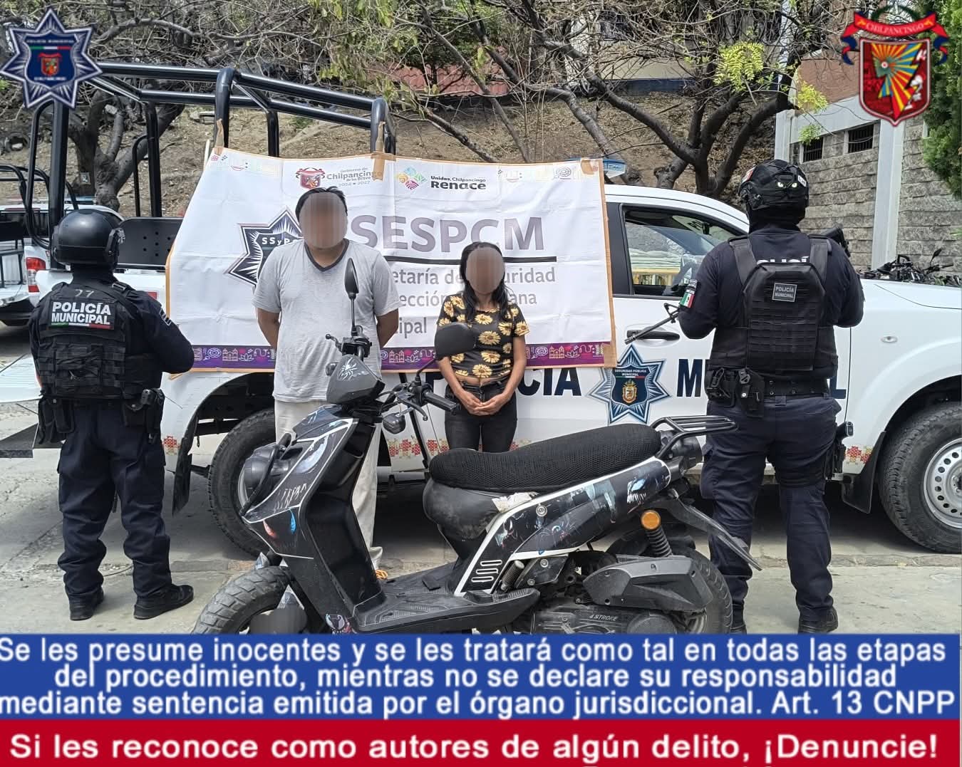 En una primera acción, derivada de recorridos preventivos en la colonia Rubén Mora, policías municipales atendieron el llamado de una ciudadana que reportó el robo de su motoneta. Minutos después, la unidad fue localizada y recuperada, y dos personas un masculino y una femenina fueron detenidas y puestas a disposición del Ministerio Público.