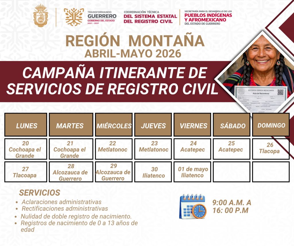 Chilpancingo, Gro., 14 de abril de 2026.- El gobierno del Estado, a través de la Coordinación Técnica del Registro Civil y en coordinación con la Secretaría para el Desarrollo de los Pueblos Indígenas y Afromexicanos (SEDEPIA), realizará una campaña itinerante de servicios del 20 de abril al 1 de mayo en la región Montaña.
