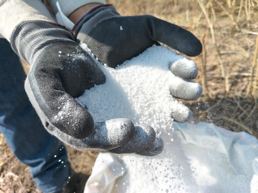 Urea en El Batán, Texcoco: en este campo experimental del CIMMYT se desarrollan y validan prácticas para usar fertilizantes de manera más eficiente y explorar alternativas que permitan a los productores enfrentar la volatilidad en los insumos. Fotografia: Francisco Alarcón/CIMMYT