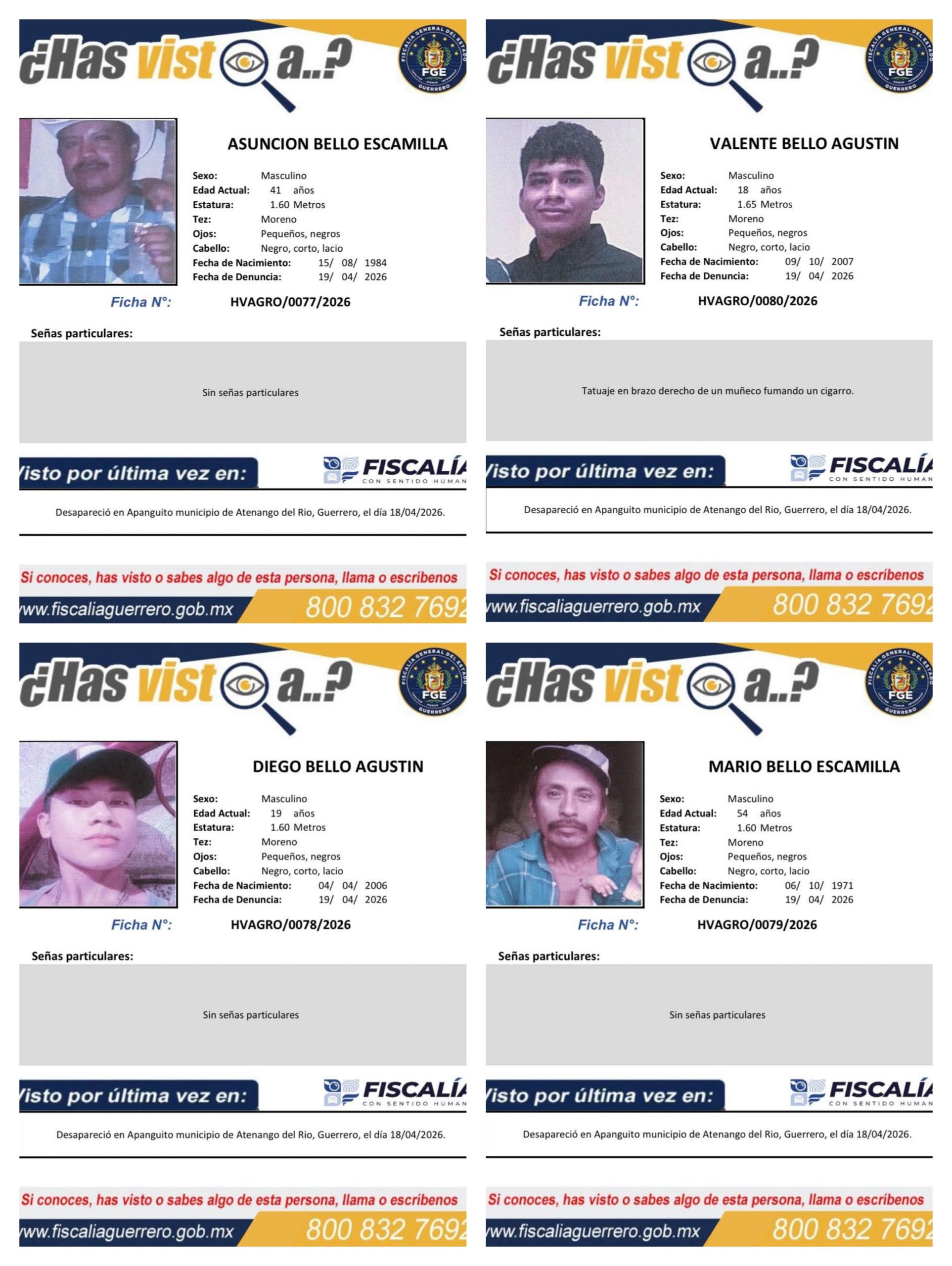 Un grupo de siete personas, originarias del municipio de Atenango del Río, Guerrero, fueron reportados como desaparecidos desde el pasado sábado. Este lunes que la Fiscalía General del Estado (FGE), emitió las fichas de búsqueda para su localización.