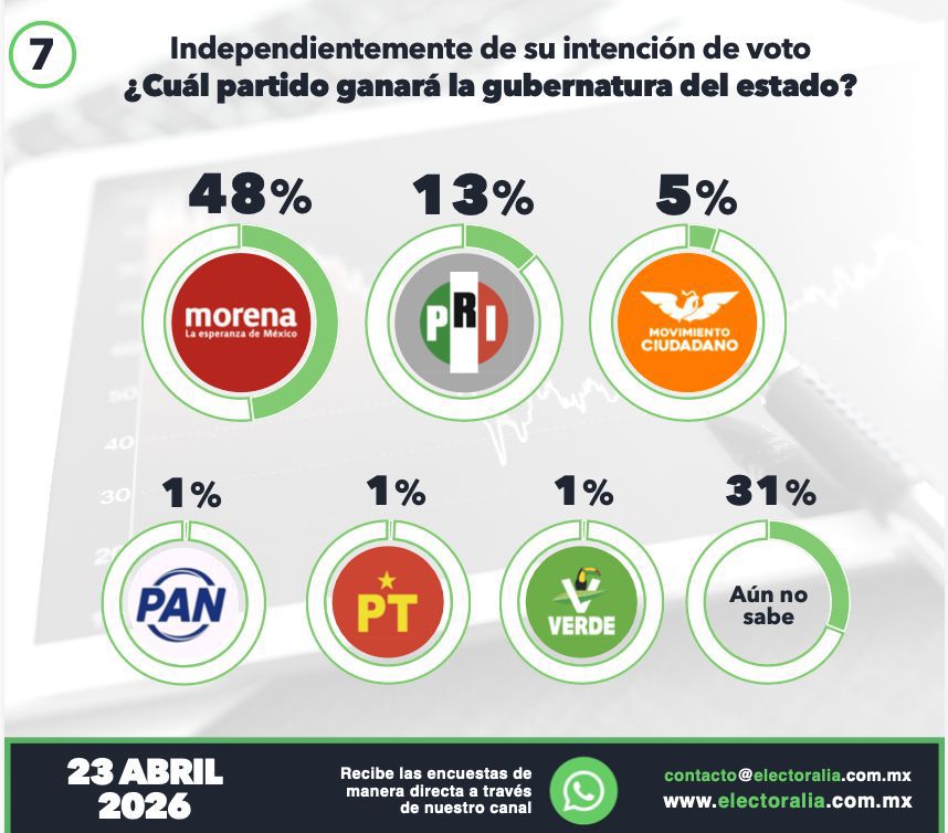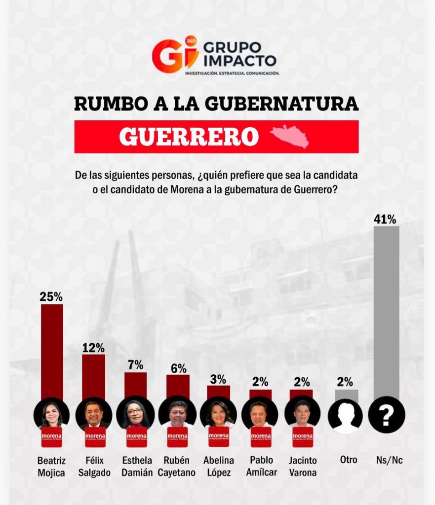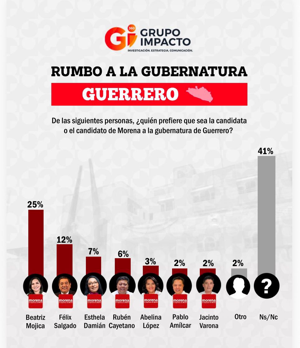 Beatriz Mojica encabeza preferencias en Guerrero rumbo a 2027; encuestas confirman ventaja sostenidaAcapulco, Gro., a 23 de abril de 2026.– Cerca ya de la elección para la gubernatura de Guerrero, la senadora Beatriz Mojica Morga se posiciona como la figura con mayor respaldo ciudadano dentro de Morena, de acuerdo con los más recientes estudios demoscópicos elaborados por las casas encuestadoras Electoralia y Grupo Impacto.El estudio de Electoralia, levantado en abril de 2026 bajo el ejercicio “Rumbo 2027”, revela que Morena mantiene una ventaja clara en intención de voto con 47%, muy por encima de otras fuerzas políticas como el PRI (14%) y Movimiento Ciudadano (11%). En este contexto, la medición interna sobre la candidatura de Morena ubica a Beatriz Mojica con 37% de preferencia, colocándola en el primer lugar, seguida por Pablo Amílcar Sandoval con 24%, mientras que otros perfiles como Esthela Damián (6%), Abelina López (4%) e Iván Hernández (4%) se encuentran rezagados. En un escenario abierto de competencia por la gubernatura, la misma encuestadora sitúa a Mojica con 39% de intención de voto, ampliando su ventaja frente a otros actores políticos como Manuel Añorve (17%), Mario Moreno Arcos (11%) y Yesenia Galarza (7%). Este resultado confirma no sólo su liderazgo interno en Morena, sino también su competitividad frente a la oposición.Por su parte, la medición de Grupo Impacto (GI360) refuerza esta tendencia. En su estudio, Morena alcanza el 49% de intención de voto, mientras que el PRI registra 9%, Movimiento Ciudadano 6%, PAN 3% y PT 1%, con un 32% de indecisos. En cuanto a la definición de candidatura dentro de Morena, Beatriz Mojica aparece nuevamente en primer lugar con 25%, superando ampliamente a Félix Salgado Macedonio (12%), Esthela Damián (7%), Rubén Cayetano (6%) y Abelina López (3%).El estudio de Grupo Impacto detalla además su metodología: un levantamiento telefónico realizado del 7 al 13 de abril de 2026, con una muestra de 600 entrevistas a mayores de 18 años en Guerrero, con un nivel de confianza del 95% y un margen de error de ±3.94%, lo que le otorga solidez estadística a los resultados presentados.Ambas encuestas coinciden en dos elementos clave: por un lado, el dominio electoral de Morena en Guerrero rumbo a 2027; y por otro, el posicionamiento de Beatriz Mojica como el perfil más competitivo tanto al interior del partido como frente a otros actores políticos.Este posicionamiento responde a una estrategia de trabajo territorial sostenido, así como a su visibilidad en temas legislativos, culturales y sociales desde el Senado de la República, donde ha impulsado agendas vinculadas a derechos humanos, cultura y desarrollo regional.La tendencia favorece a quienes ya cuentan con reconocimiento, estructura y presencia en el territorio. En ese sentido, los datos colocan a Mojica no sólo como puntera en las encuestas, sino como una de las figuras con mayor viabilidad política rumbo al proceso electoral de 2027 en Guerrero.