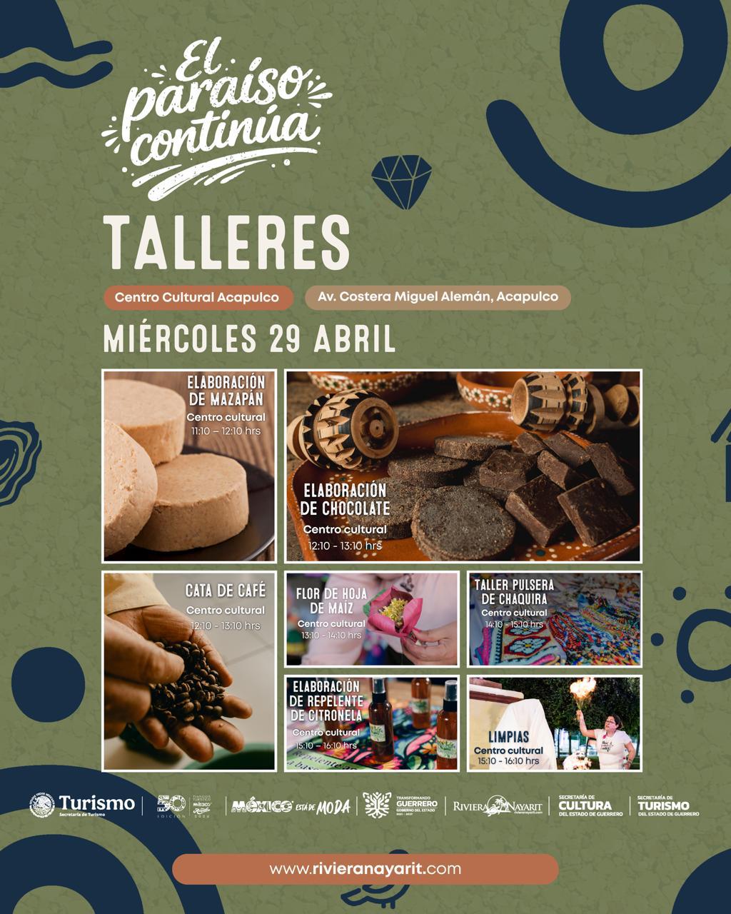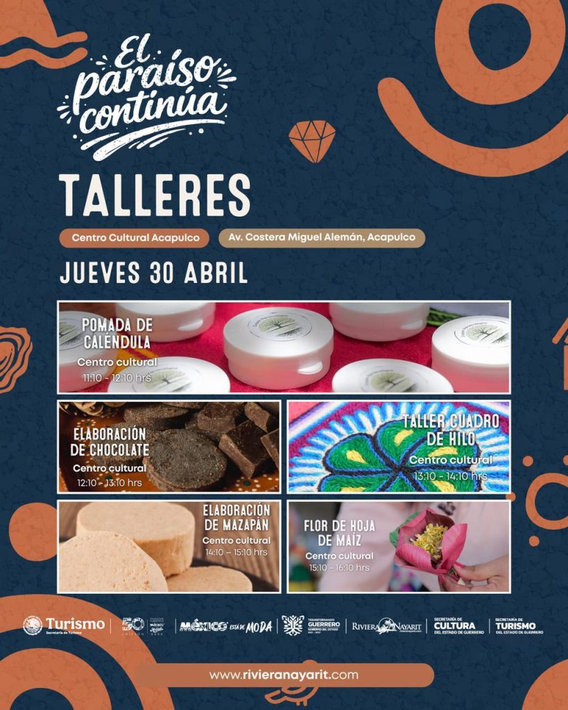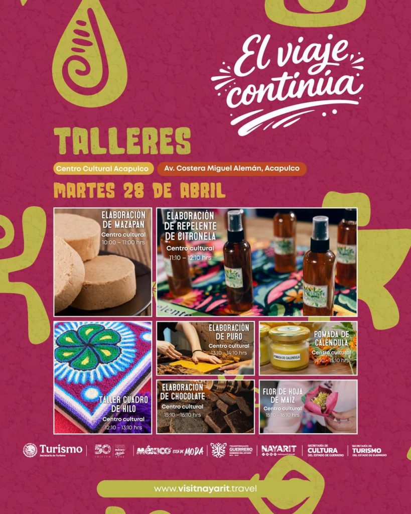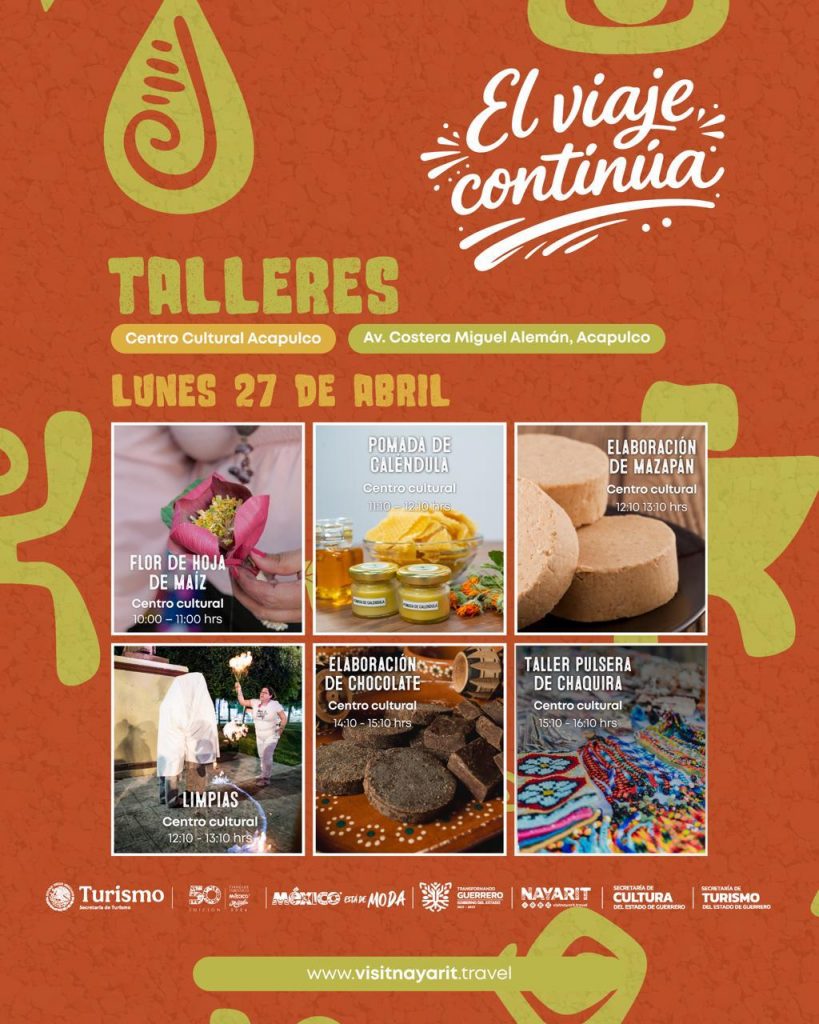 Del 27 al 30 de abril, el Centro Cultural Acapulco abrirá sus puertas para recibir a visitantes interesados en aprender desde la elaboración de flores de hoja de maíz hasta la creación de pulseras de chaquira, pasando por experiencias sensoriales como la preparación de chocolate artesanal y catas de café.