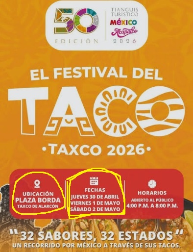 La delegada de la Secretaría de Turismo de Guerrero (Sectur) en la zona norte, Areli Margarita Castell Roldan, anunció erróneamente las fechas en que se llevará a cabo el “Festival del Taco, 32 Estados, 32 Sabores” en Taxco y convocó únicamente a restauranteros a participar del 30 de Marzo al 2 de Mayo en el encuentro gastronómico, cuando el gobierno federal emitió la publicidad donde especifica que la actividad será del 30 de Abril al 2 de Mayo en el centro histórico.