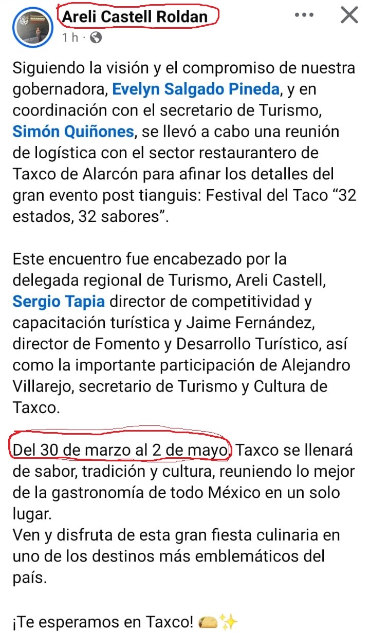En la víspera, la Secretaría de Turismo del gobierno federal (Sectur) y en el marco de la edición 50 del “Tianguis Turístico México Acapulco 2026”, dio a conocer la información oficial del “Festival del Taco” a efectuarse del 30 de Abril al 2 de Mayo en el centro de la ciudad, pero Castell Roldan replicó de manera equivocada la fecha de la actividad gastronómica al difundir que el evento inaugural sería el 30 de Marzo y con ello generó confusión entre diferentes sectores de la sociedad.