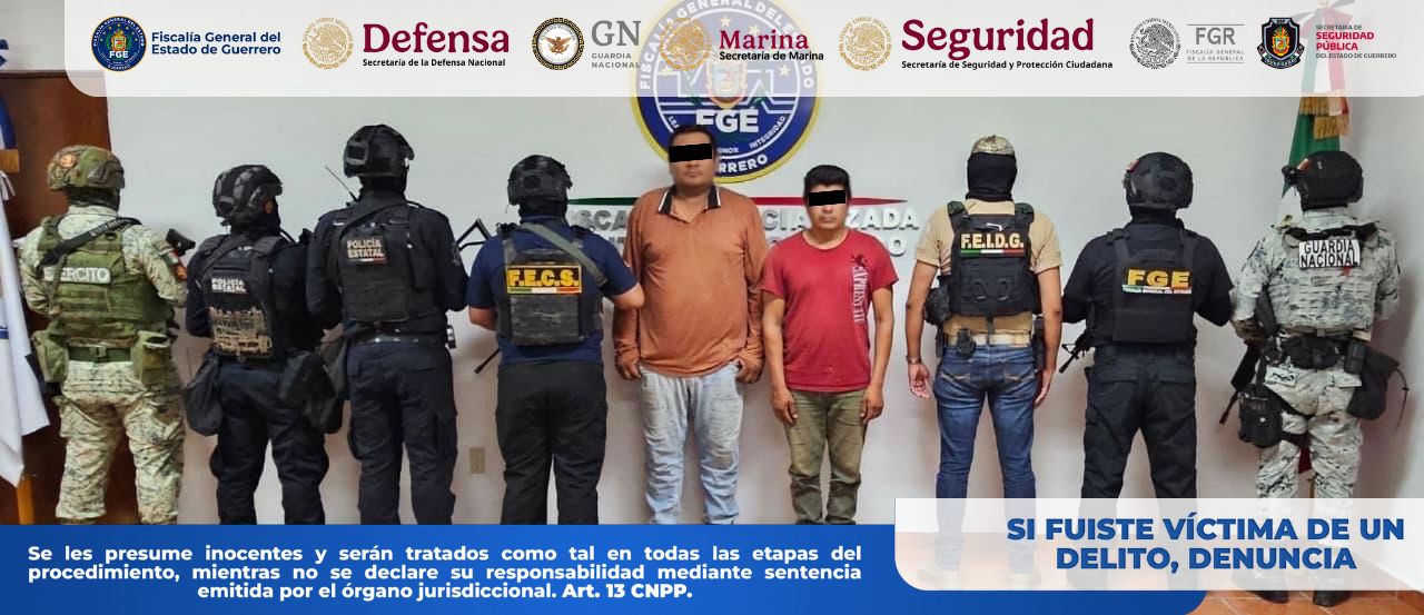 Chilpancingo, Gro., a 27 de marzo de 2026.– La Fiscalía General del Estado de Guerrero informa que, en coordinación con la Secretaría de la Defensa Nacional (DEFENSA), Guardia Nacional (GN), Secretaría de Marina (SEMAR), Secretaría de Seguridad y Protección Ciudadana (SSPC) y Policía Estatal (SSPGro), cumplimentó una orden de aprehensión en contra de Víctor Hugo “N” y Miguel “N”, por su probable responsabilidad en los delitos de extorsión agravada y desplazamiento interno forzado, en agravio de varias víctimas de identidad reservada, en el municipio de Chilpancingo de los Bravo, Guerrero.