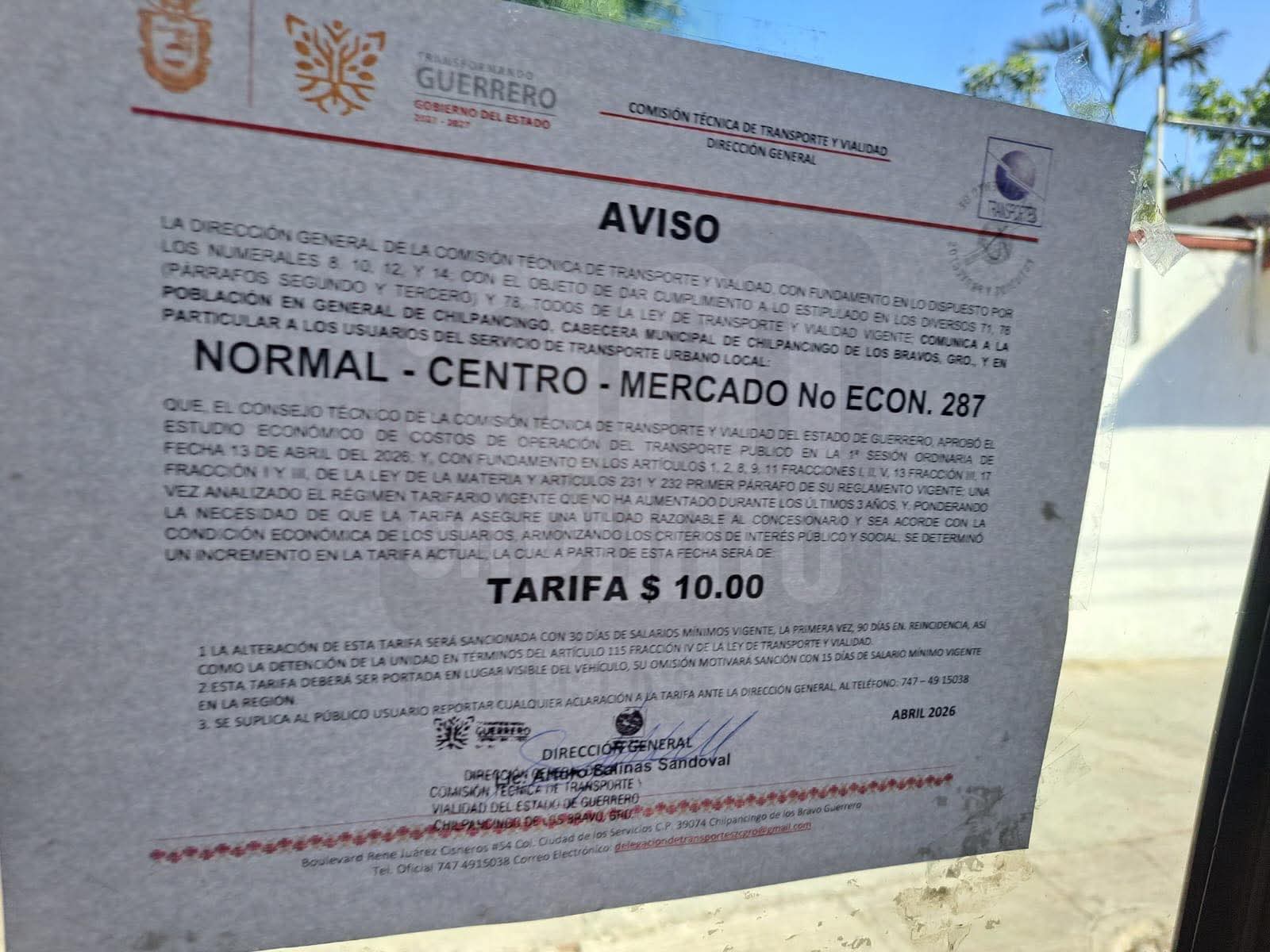 A más de 20 días de que los transportistas urbanos de Chilpancingo aumentaron de ocho a 10 pesos la tarifa del pasaje en el transporte público, la Dirección General de la Comisión Técnica de Transporte y Vialidad del Gobierno del Estado finalmente oficializó este arbitrario incremento.