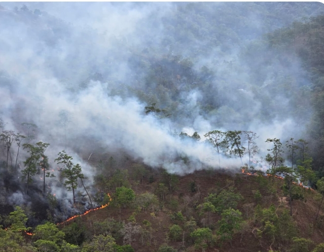Montaña de Guerrero, 9 de abril de 2026. Un incendio activo que inició el 4 de abril de 2026 ha reducido a cenizas 385 hectáreas el bosque de pinos y encinos en los muncipios de Cochoapa el Grande, Metlatónoc, Igualapa y Tlacoachistlahuaca de la Montaña y Costa Chica de Guerrero.