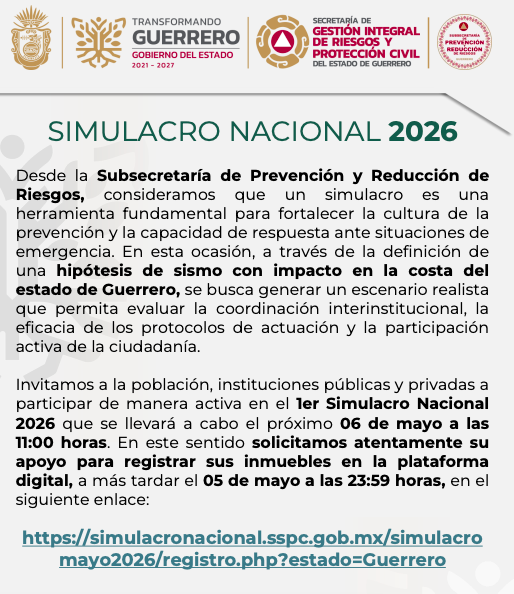 El gobierno del estado solicita el apoyo de las instituciones públicas y privadas para registrar sus inmuebles en la plataforma digital, a más tardar el 05 de mayo a las 23:59 horas, en el siguiente enlace: https://simulacronacional.sspc.gob.mx/simulacromayo2026/registro.php?estado=Guerrero